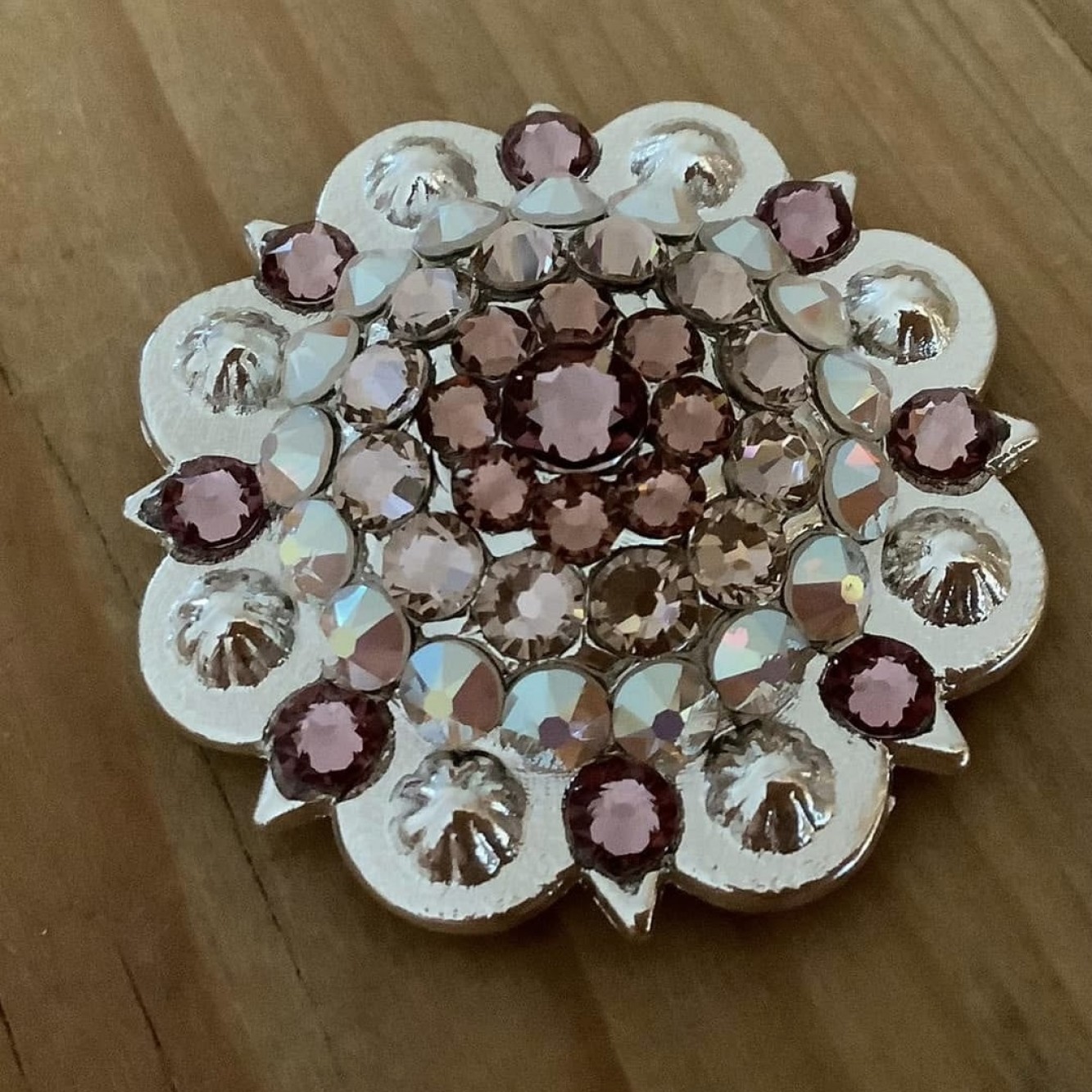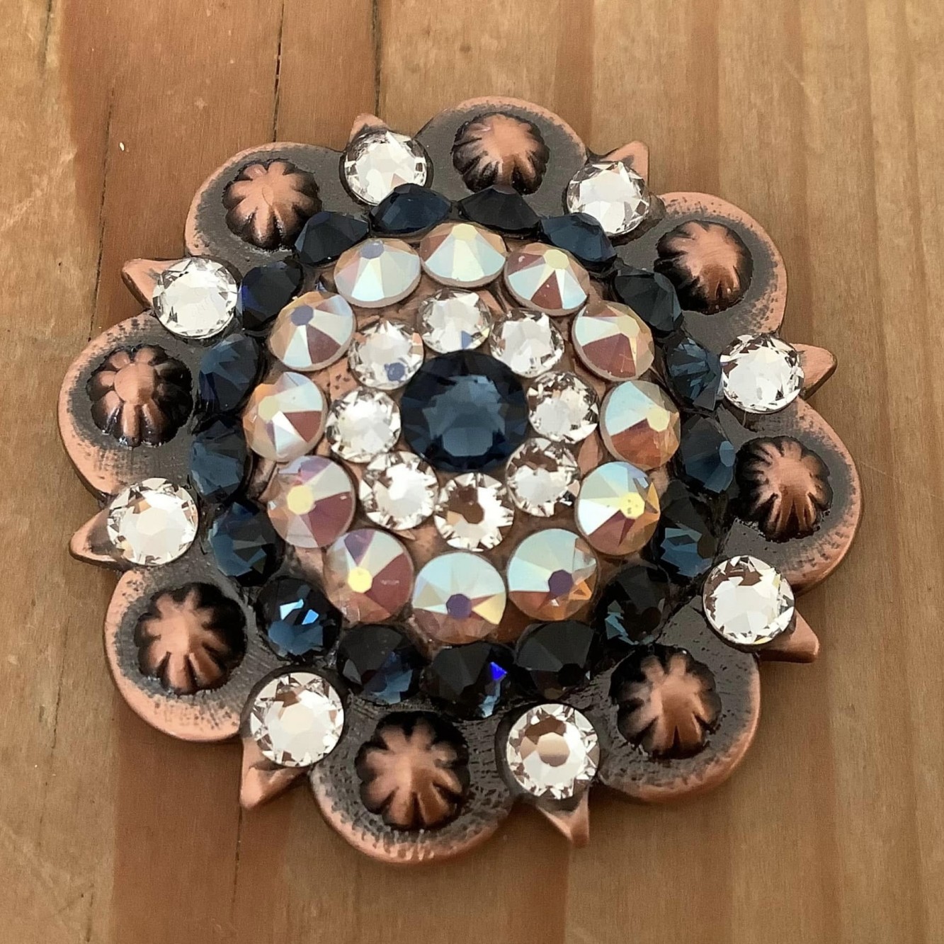 abgebildet ist ein Concho in 1-3/4“ (ca. 4.4 cm) in kleineren Größen sind auch kleinere Kristallgrößen verstrasst.